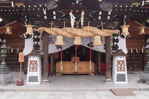 婆婆也是看到拝殿旁的指示牌,說在這座莊嚴的拝殿的上方(拝殿破風![]()