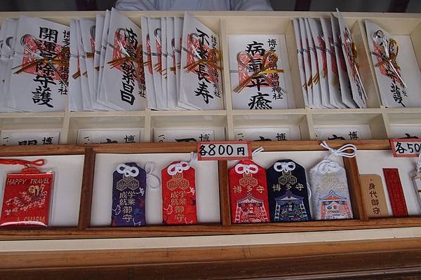 剛才提到,櫛田神社主求不老長壽及生意興隆;因此在拝殿右側的售賣處,便會看見許多祈求長壽健康、生意興隆的御守、飾物、繪馬在販售。