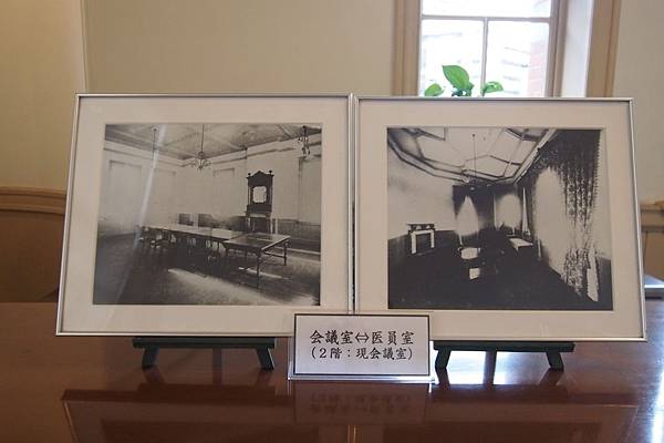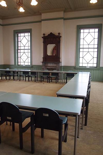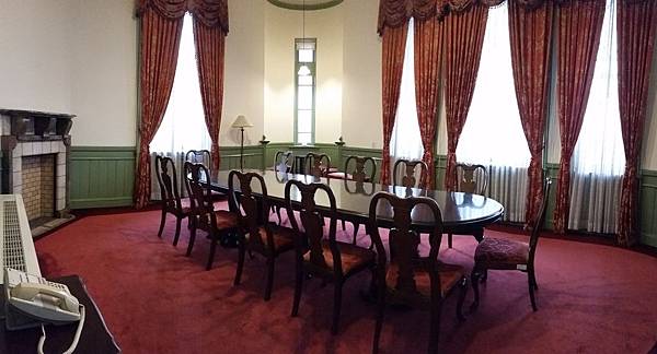 比一號會議小約半的二號會議室採用圓形桌子(圓桌會議XDD??);最特別的是那三組充滿幾何特色的窗櫺。