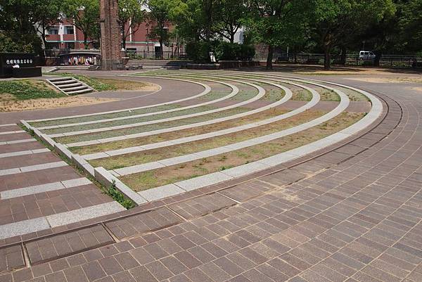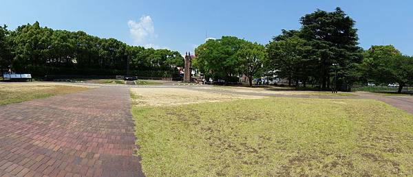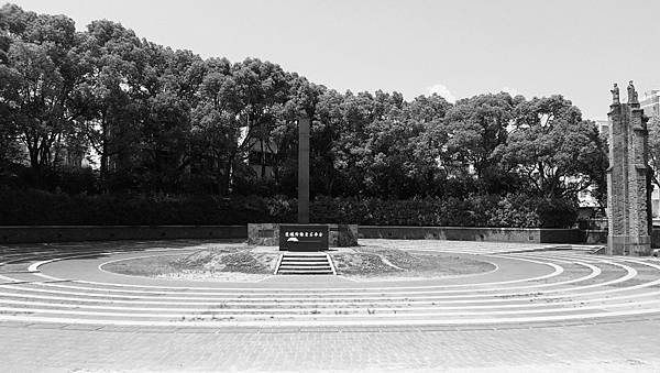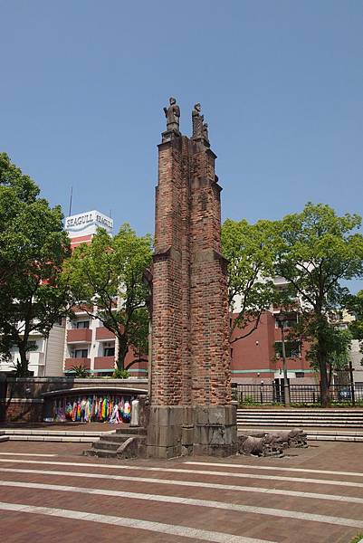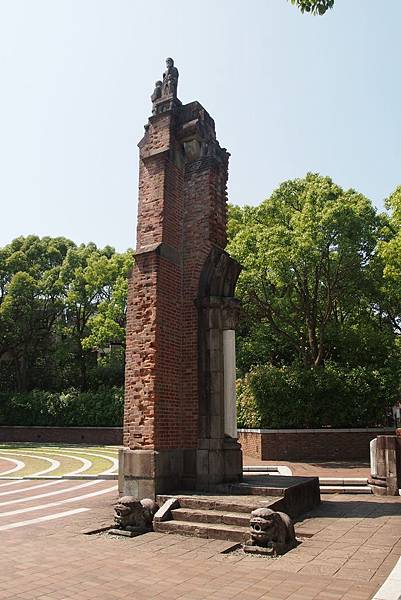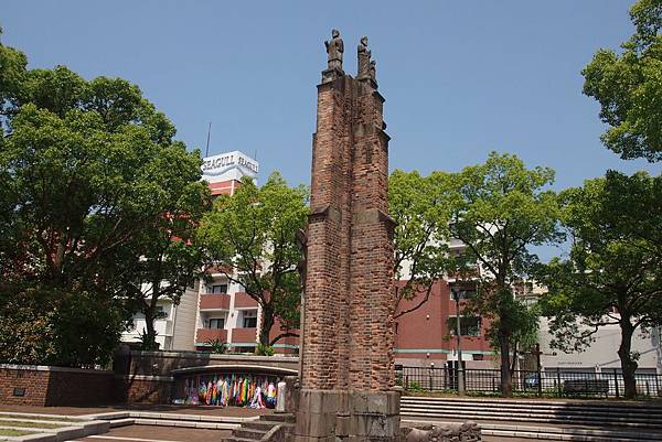這座像柱子的建築物,其實是「浦上天主堂」遭到原爆後,殘跡搬移而來的「舊浦上天主堂遺壁」。