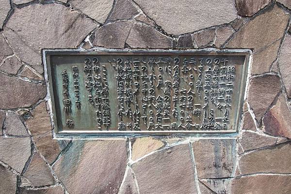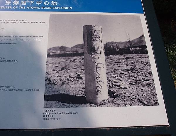 這張照片拍攝於1945年10月,這是在原子彈投下後最初建立的標柱,表示這裡是原子彈落下的中心地點;其後經過多次重建,才變成轟立在此地的黑花崗岩石柱。