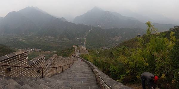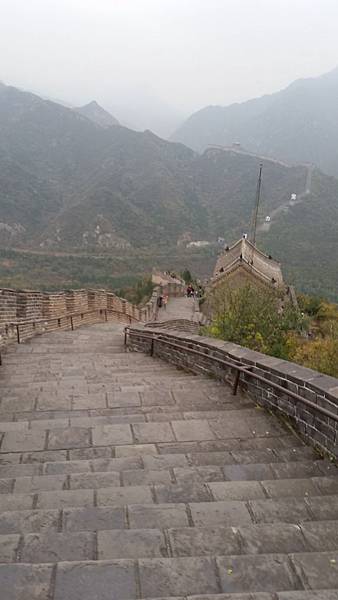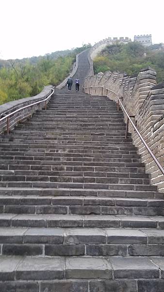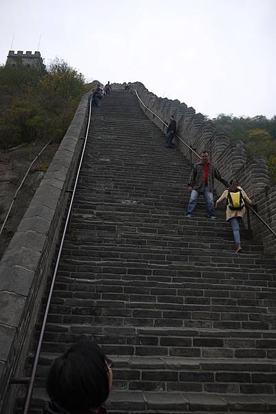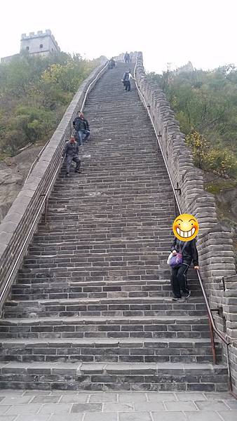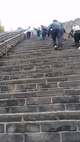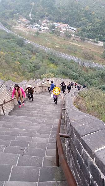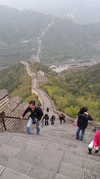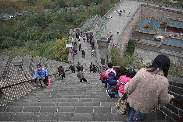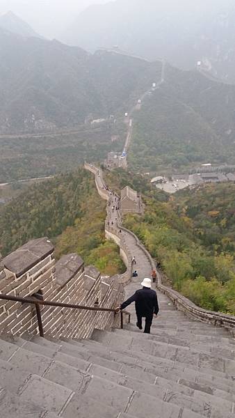由於長城十分陡斜,加上每個階梯相距都很遠,因此必須用力握著扶手保持平衡,一個接一個的往下走,使得下城之路變得漫長而且費力。