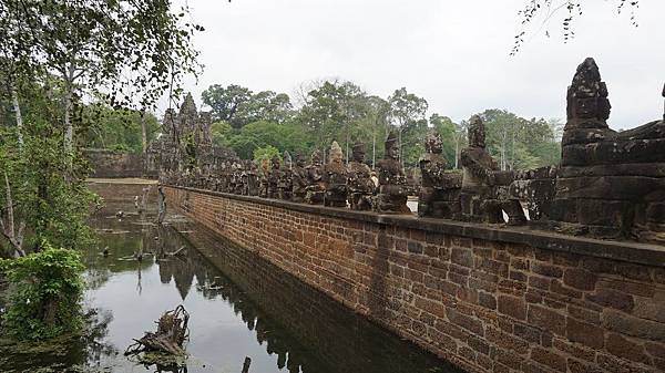 大吳哥城由城牆和護城河保護,城牆高8米,城牆外就是護城河;