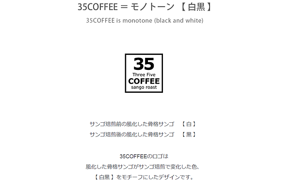 在品牌用色方面,由於白化珊瑚在焙煎前是白色,經焙煎後的珊瑚骨骼會變成黑色,因此35COFFEE的主題顏色為黑白色,象徵白化珊瑚烘焙前後的顏色變化。