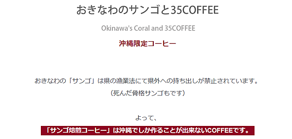 創業於平成5年(1993年)的「35 COFFEE」,作為參與「沖繩的觀光與長壽」企劃的商社,透過開發並出售以白化珊瑚烘焙的咖啡,從而捐出部份賣出咖啡的收入作為珊瑚種植活動,以實現保護海洋生態環境的可持續發展。