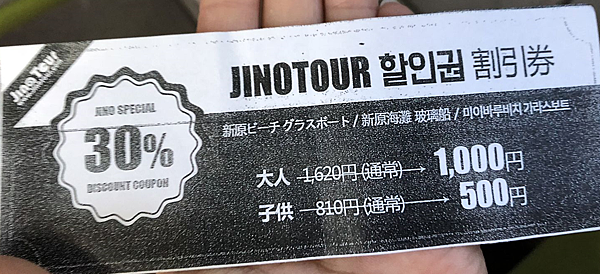 上車後,司機會派發「新原海灘」海上觀光玻璃船的折扣優惠卷。