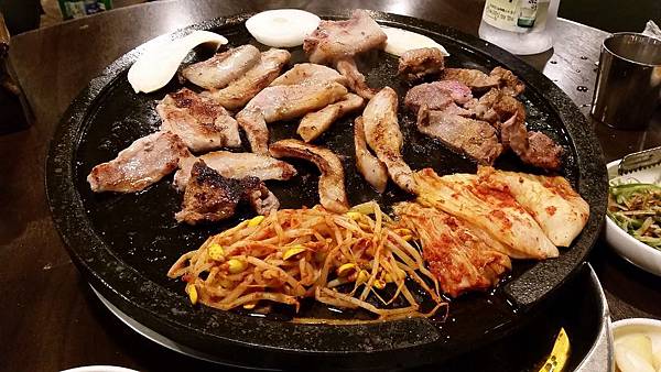 侍者先送上一般的烤肉配料:生菜、紫蘇葉、沙律、醃蘿蔔、黃豆芽、蒜片、生薑、豆醬、海帶、泡菜等,沒多久豬肉也送上來了。