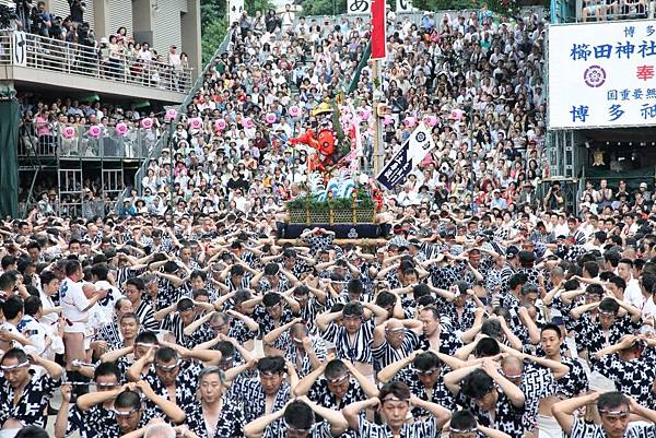 「舁山笠」的速度感配合勇者們勇猛的吆喝聲,堪稱博多祗園山笠祭的最大魅力所在。位於終點的須崎町是隊伍「過彎止步」的地方,屆時山笠會加速,勇者們的吆喝聲勢則更加浩大,是體驗山笠祭氣氛的絕佳場所。