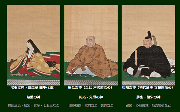 神社內供奉著被稱為「西國第一強者」、身經百戰的武將:初代柳川藩主的 立花宗茂公、其夫人、以及岳父 戸次道雪公 三位祭神,因而亦稱作「三柱神社」。