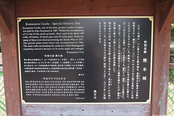 享譽為日本三大名城之一的熊本城,前身是室町時代阿蘇家的隈本城,後來至1607年由名將加藤清正重新築城改建而成;在安土桃山時代,豐臣政權入主肥後國後,此城即成為當地藩主的官邸,面積達九十八萬平方公尺。