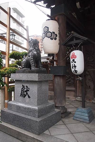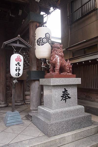 守著「櫛田神社」(後門)的一對石獅。(莫名吸引婆婆的目光……)