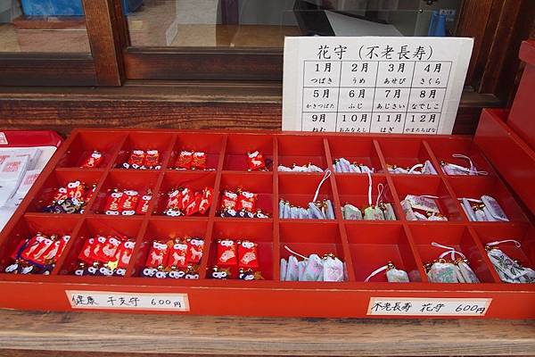 剛才提到,櫛田神社主求不老長壽及生意興隆;因此在拝殿右側的售賣處,便會看見許多祈求長壽健康、生意興隆的御守、飾物、繪馬在販售。