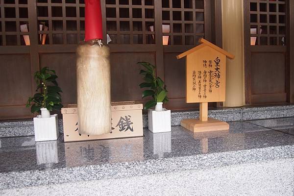 婆婆也是看到拝殿旁的指示牌,說在這座莊嚴的拝殿的上方(拝殿破風![]()