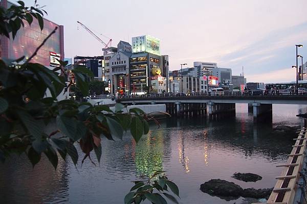 餘暉緩緩吐納,在黑夜來臨前綻放最後的燦爛,剩餘的氣息把整片天空染成醉人的藍;那珂川伴隨起舞,艷麗的倒影與熱情的幻燈浪漫共舞,現場便如一個紙醉金迷的大舞池。