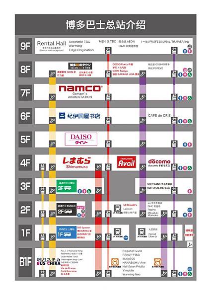 「博多巴士總站」,顧名思義,是博多的巴士總站;(欸欸這人有說話嗎? 深入點來說,除了一樓是市內巴士總站及二、三樓是長途巴士站之外,其餘樓層均各有自己角色;