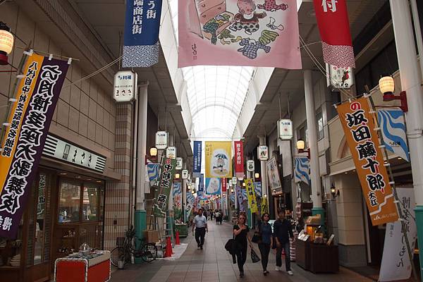 商店街的屋頂呈圓拱型,沿途整齊地掛著充滿博多特色的旗幟。