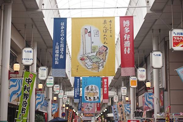 川端商店街全長約400米,是一個集合博多特色、傳統及歴史的商店街;商店街内集合了大約百多間具有「博多味道」的店舖,如博多工藝品、博多山笠祭的服飾、博多拉麵等等,是個感受博多風土人情的好地方。
