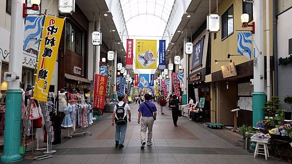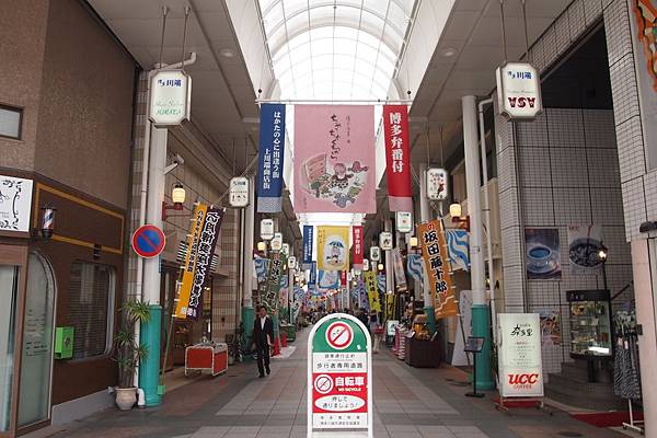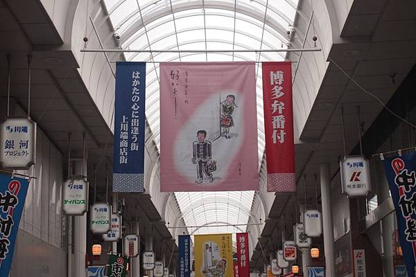 商店街的屋頂呈圓拱型,沿途整齊地掛著充滿博多特色的旗幟。