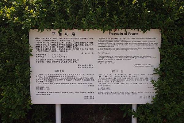 為了向這些痛苦的靈魂祈福並奉上清泉,藉此希望殉難者得以安息;長崎政府利用全國捐款在此地修建了「和平之泉」,祈禱廢止核武器、並祝願世界永久和平。