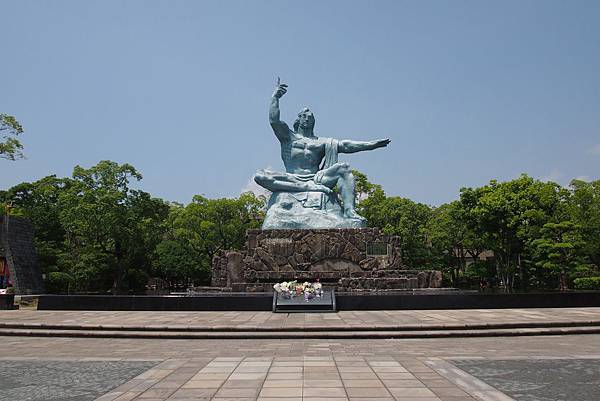 「平和祈念像」是由長崎出身的雕塑家北村西望以神的愛與佛的慈悲為象徵,指天的右手象徵著原爆的威脅,水平伸展的左手象徵和平,而輕閉的雙眼則是為原爆犧牲者祈福,訴說著長崎人民祈求和平的心願。