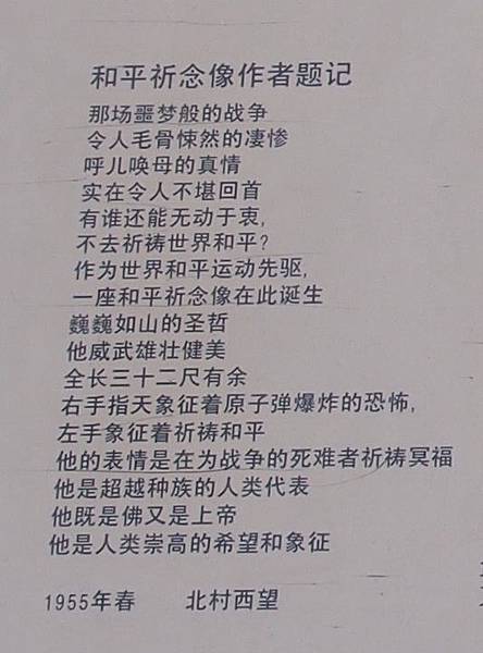 (日文中譯:這段作者的話(同樣)刻在「平和祈念像」裡(旁邊)。)