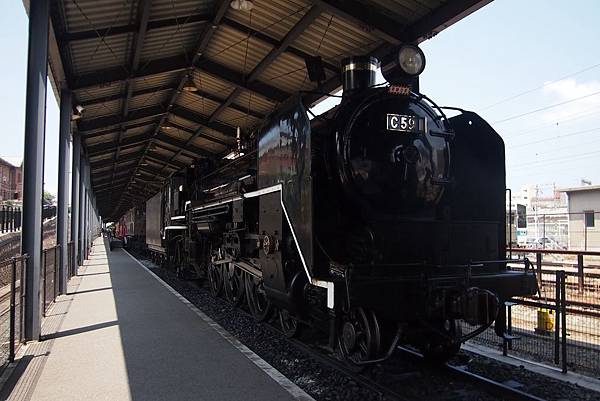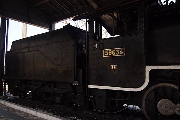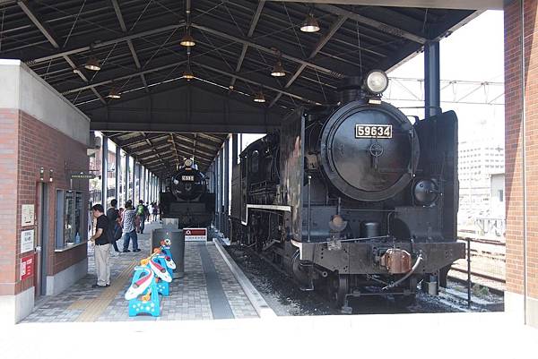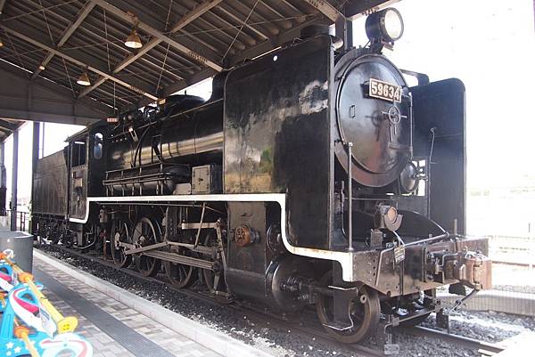 宛如站台的車輛展示場裡,展示出曾活躍於九州各地鐵路的9輛退役名車;首先映入眼簾的,是名字非常有意思的59634號 蒸汽火車。