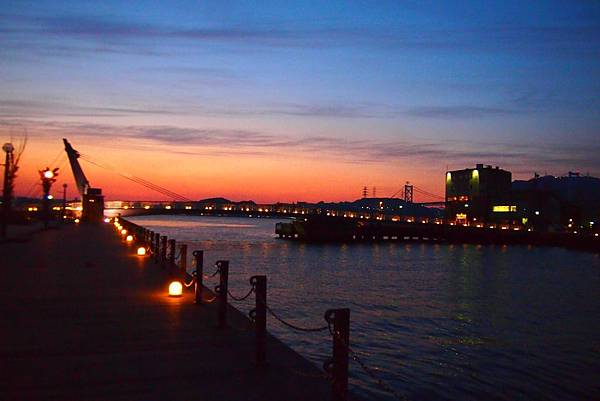 婆婆第一次看見,在藍靛背景下閃耀的夜,在門司港。