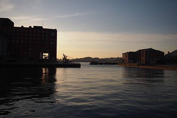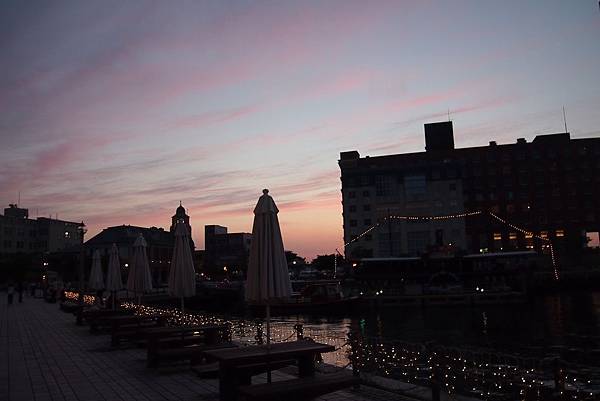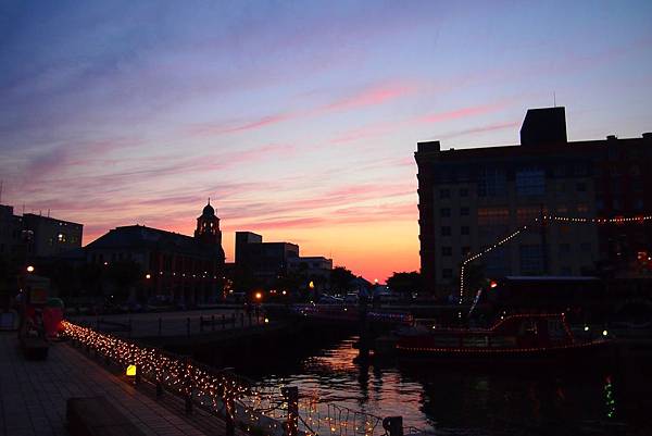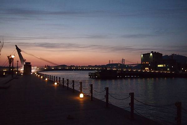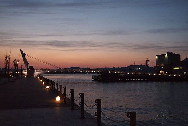 原來淡黃色的天空塗上一抹抹紅彤彤的晚霞,在沉黑的背景下尤如極與極的對比;海峽兩旁掛滿了被點亮的星光,像是在黑暗中燃起的點點希望,整個海峽的氣氛變得夢幻又浪漫