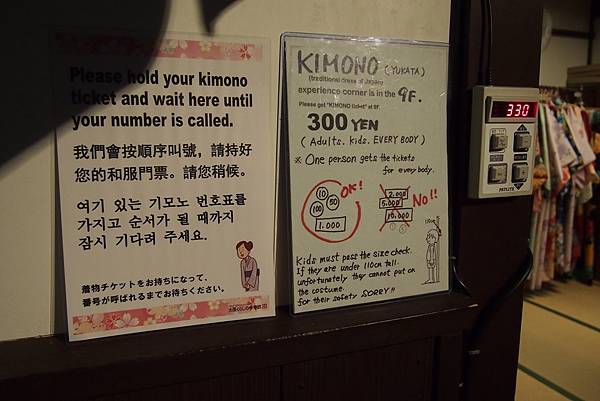 當我們用大半小時遊畢整層9樓之後,沿樓梯前往下層時才發現:和服體驗是要拿「籌號」排隊入場的!!! 沒搞清狀況的老人家還一直以為是「即入場即體驗」,因此大無畏地在上層耗了很久,結果來時拿到的籌號已經是「最後一輪」的入場號碼。(每輪人士可體驗三十分鐘,我倆最後得到4時半的籌號。)