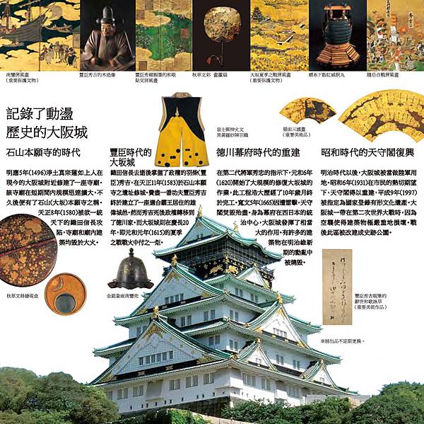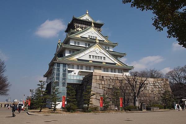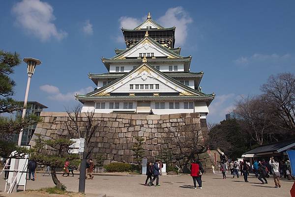大阪城天守閣曾多次經歷戰火燒燬及雷擊,至今已經是由市民籌款重建而成的第三代天守閣;潔白的城牆鑲上鍍金裝飾及浮雕,氣派非凡。