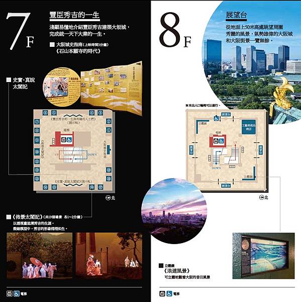 天守閣共有八層,內設置成歷史博物館,展示文化財產或復原的黃金茶室;也可以在二樓試戴頭盔・試穿陣羽織等;最上層是遍覽東西南北的展望台,從展望台眺望街景,寬敞的大阪城公園、近代的高層建築、大阪平原、遠處聳立的山脈盡收眼底,景色絕佳。