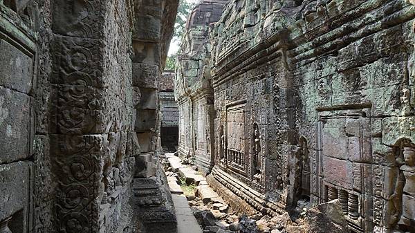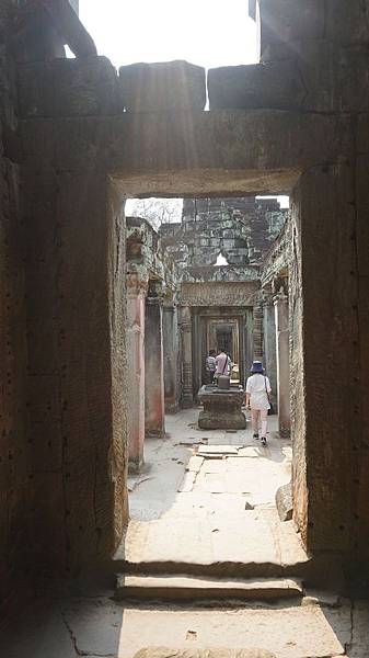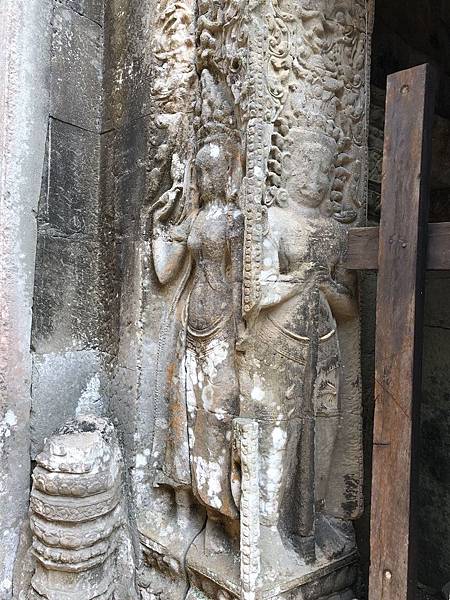 寺內通向中央聖堂的道路由拱頂長廊組成,長廊兩側以粗大的四方石柱支撐,一路上一扇扇石門邊上裝飾著諸神的雕像,牆上裝點著無數的仙界跳舞女神Apsara,姿態曼妙。
