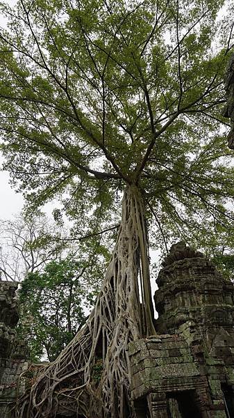 結實雄大的塔普倫寺,被當地人稱為蛇樹的卡波克(Kapok)樹所盤踞,它們粗壯堅硬的根莖,繞過樑柱、探入石縫、盤繞在屋檐上、包裹著門窗;由一顆不起眼的小種子開始,歷經近千年的努力,深穩緊密地盤結綑縛著神廟,讓枝幹堅強有力地向天攀升。