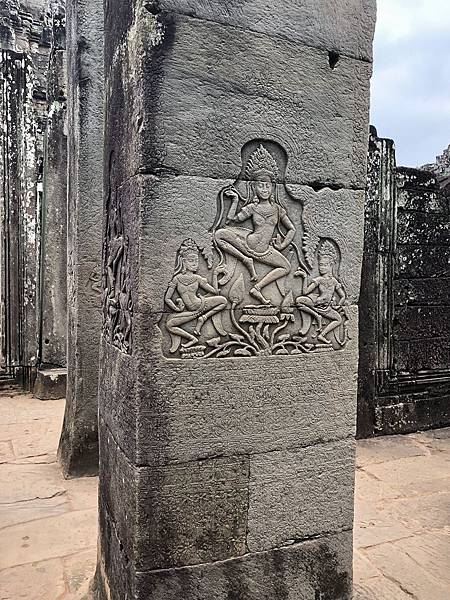 由巴戎寺東門順時針刻劃的浮雕內容依序是:出征占婆、高棉族與占婆族在洞里薩湖水戰、水上生活、吳哥戰勝占婆的戰爭、高棉族百姓的日常生活、軍隊、內戰、大魚吞羊、勝利遊行、馬戲團及占婆人洗劫吳哥等等……