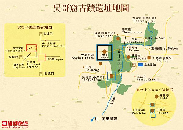 吳哥城佔地9平方公里,城中心有巴戎寺(Bayon),城外建有護城河,在這範圍內散佈多處吳哥古都遺跡:如吳哥窟(Angkor Wat)、巴普昂寺(Baphuon)、女皇寺(Banteay Srei)、巴戎寺(Bayon)、神牛寺(Preah Ko)、巴孔寺(Bakheng)、鬥象台(Terrace of the Elephants)等等…
