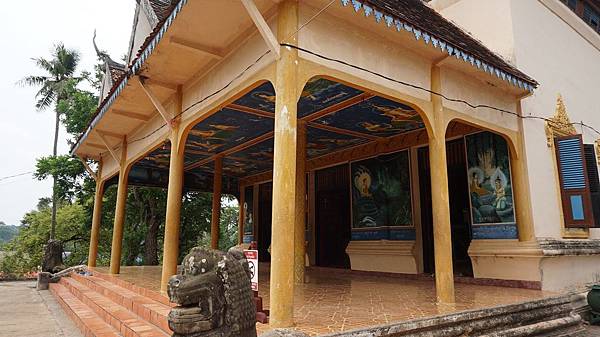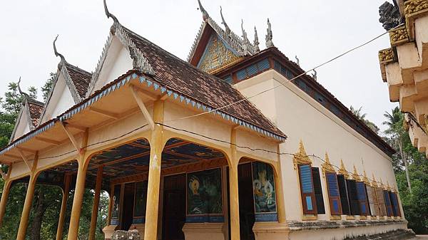 寺內由每邊8條的圓柱支撐,柱上繡著花,又似是蛇紋;寺廟中間有尊被金光繚繞的大佛,佛像兩旁約有八尊護法,前方有鮮花相伴,也有大鼓守護。