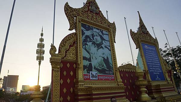 在獨立紀念碑旁邊,載著於1953年帶領柬埔寨人民擺脫法國殖民統治、贏得國家獨立,被柬埔寨政府視為國家象徵、舉國人民譽為柬埔寨獨立之父的西哈努克的相片。