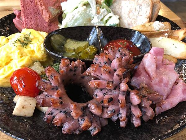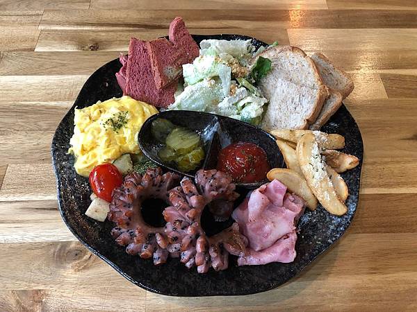 套用一句朋友的話,光是「視覺已經贏了」的這款Half Day Brunch(甚麼鬼XD 由8款食材組合(?)而成:黑椒豬肉腸、炒蛋、火腿、芝士薯角、烤雜菜、沙律、兩款麵包(經牛油烤過),還未開吃,十足的份量已給婆婆帶來視覺上滿滿的衝擊。