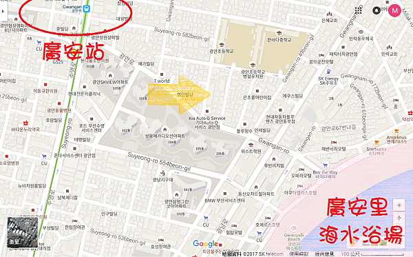 廣安里海水浴場位於廣安2洞,在海雲臺海水浴場的西邊(啊!是朋友吧)前往海水浴場可以在地鐵 二號線廣安站3、5號出口方向,徒步走約5-10分鐘。