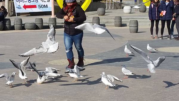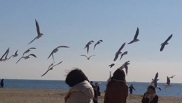 當有人餵食時,海鷗們完全馬上突變成「進擊的巨鷗」,在飛的、在走的、在散步的、在休憩的、在曬太陽的,全部簇擁在餵食人旁,吱吱喳喳地鬧過不停。