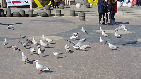 群鷗在人們頭上飛來飛去、在地上走來走去,即使大伙向牠們靠近也不會飛走,一點都不怕人,温和又友善,非常討喜。