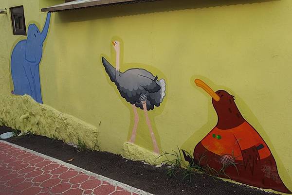 走進童話村,映入眼簾的是那分佈各處的鮮明色彩:以花朵、動物與世界知名的童話故事為主題,分別繪製成的漂亮壁畫。