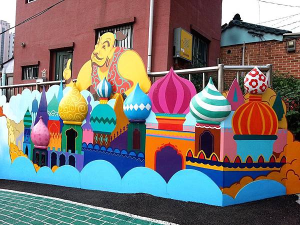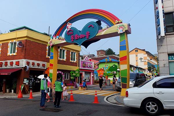 沿著中華城的壁畫街走約十數分鐘,一道七彩繽紛的彩虹拱門躍現在婆婆眼前:到埗了,這個匯聚歡樂、希望、幻想的童話世界 —— 這裡是「松月洞童話村(송월동 동화마을)」。