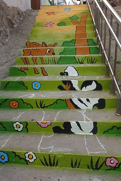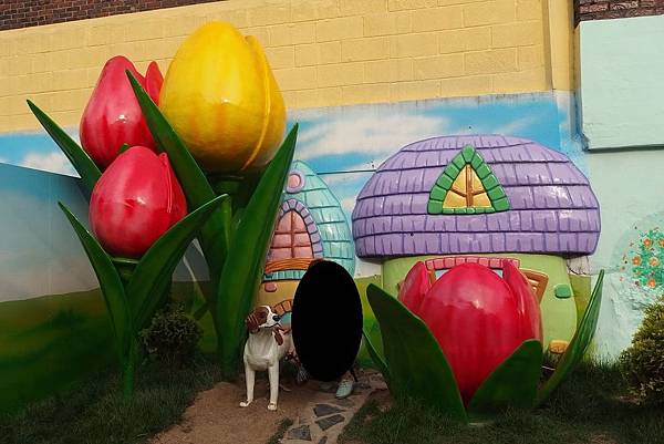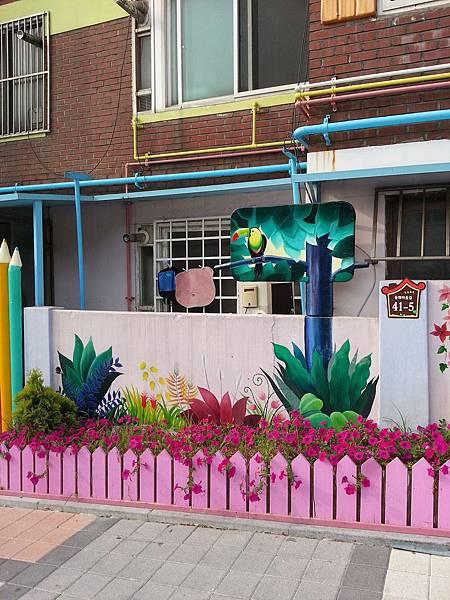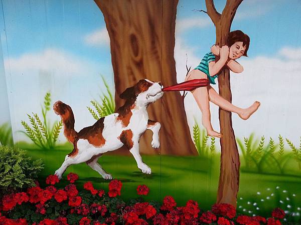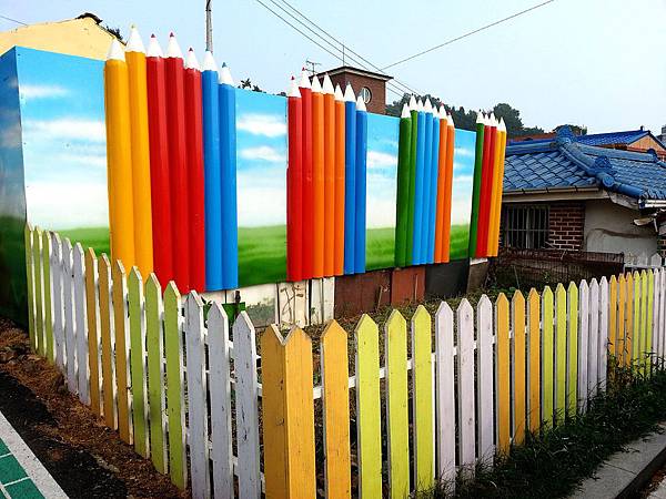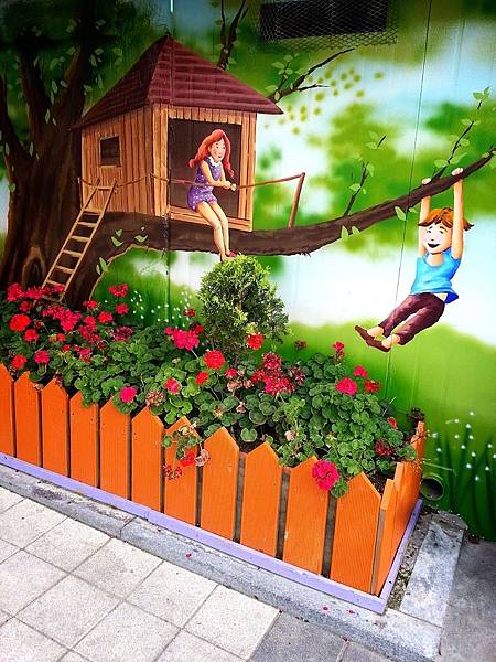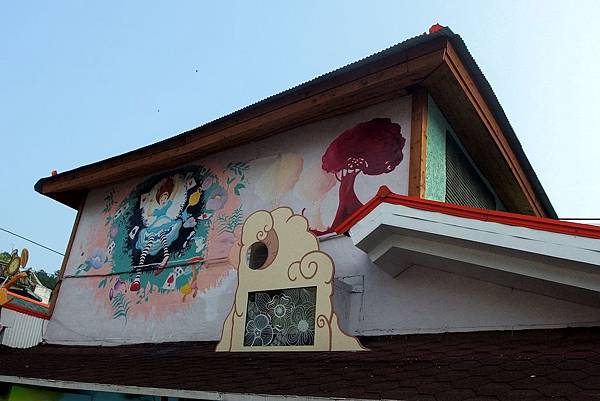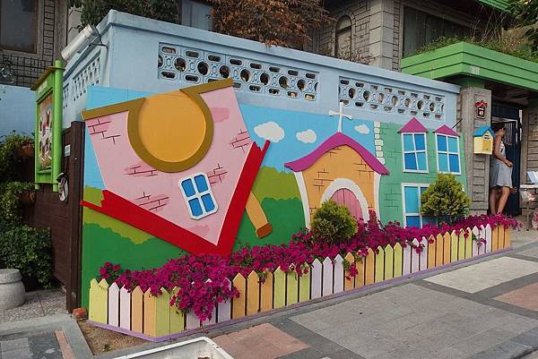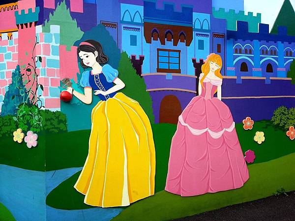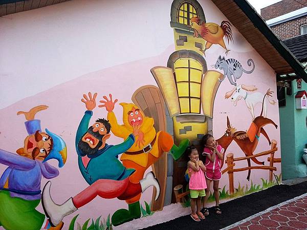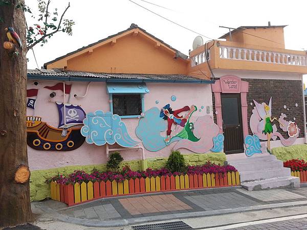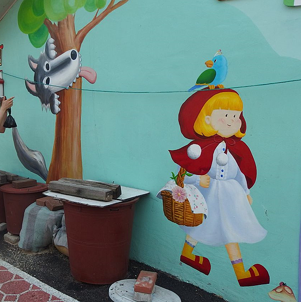 走進童話村,映入眼簾的是那分佈各處的鮮明色彩:以花朵、動物與世界知名的童話故事為主題,分別繪製成的漂亮壁畫。