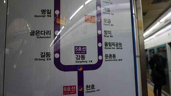 (提提大家,在江東站轉乘分線列車時,記得是要乘坐前往「馬川(마천)方向」的列車喔)