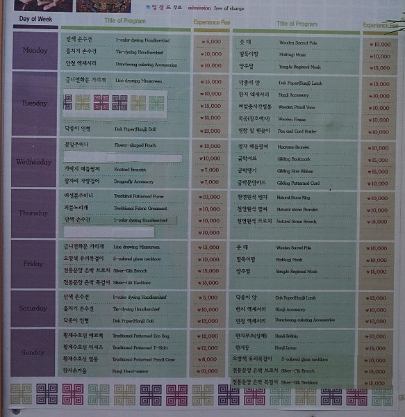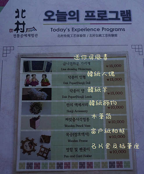 從天然染色的手帕、傳統手鏡、金箔卡片、飾品、韓紙工藝,以至螺鈿漆器、燒酒製作、筆及木筆筒、楮皮紙木偶製作等等,收費由5,000韓元至15,000韓元不等。