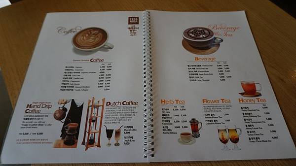 是日婆婆來的時候沒有很多客人,在一邊隨便選了個座位,快速打開餐牌(啊!飲品選擇真多啊!!這裡的點滴咖啡應該挺有名的,不過婆婆不喝咖啡嘛~~所以只點了杯***蕃薯Latte(₩5000韓元)。