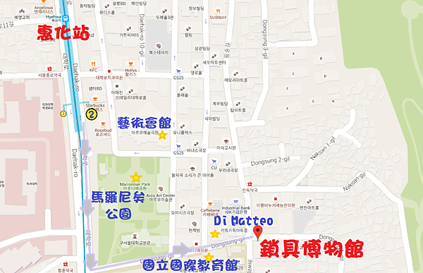 前往方法:大家可先乘地下鐵 4號線到「惠化站(혜화역)」,然後從2號出口徒步前往。