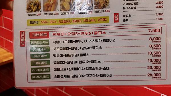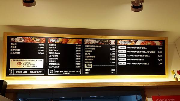 店內主要分為3大類小吃:炒年糕、炸物類、和歸類「朋友餐牌」的國民小吃。(掛著的餐牌只有寫著韓文)