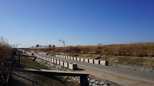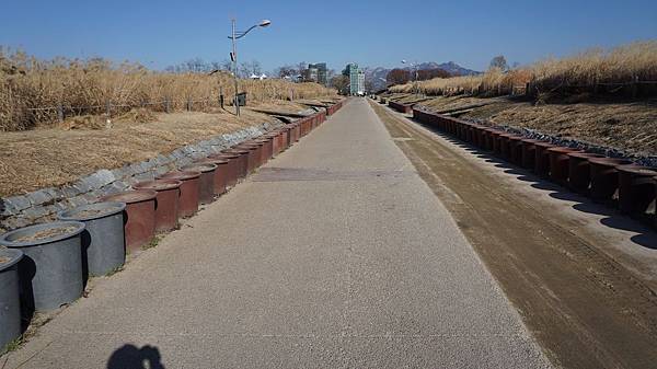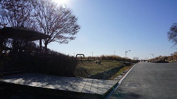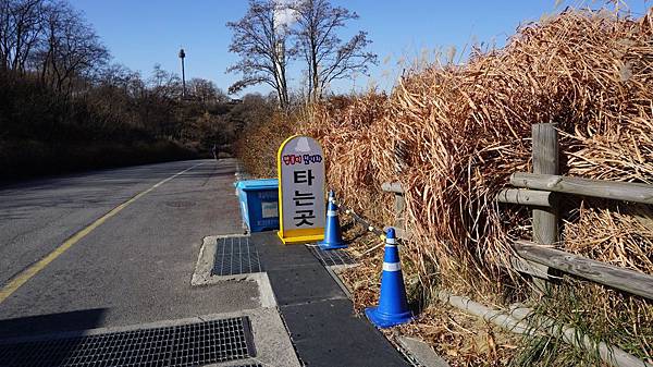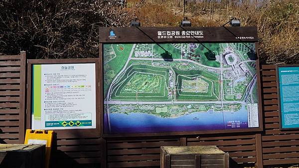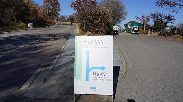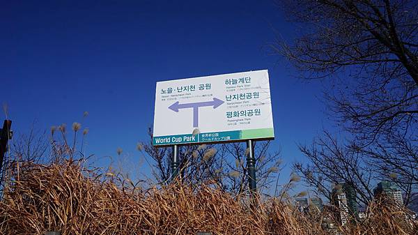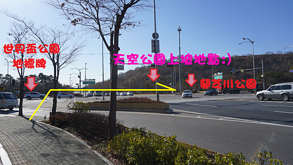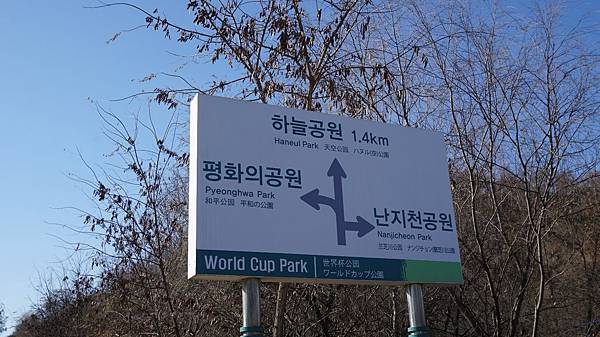 走到第一個路口,先過對面馬路(經過世界盃公園(월드컵공원)的地標牌)然後再橫過大馬路,經 蘭芝川公園到達 天空公園上坡地點。